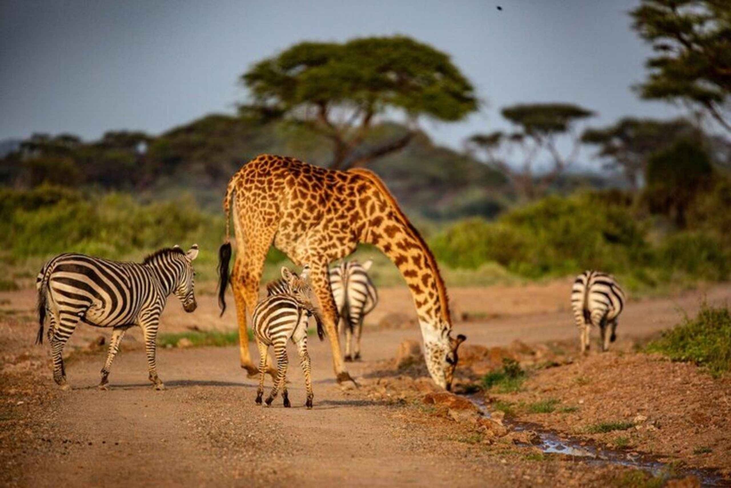 Votre journée débute tôt par une prise en charge confortable à votre hôtel ou à votre lieu de rendez-vous à Nairobi. Voyagez à travers la campagne pittoresque et les terres traditionnelles des Massaï en vous dirigeant vers le sud, en direction de la frontière entre le Kenya et la Tanzanie. À votre arrivée au parc national d'Amboseli, vous pénétrerez dans un vaste paysage de savanes ouvertes, de zones humides saisonnières et de forêts d'acacias, le tout situé sous le sommet spectaculaire enneigé du mont Kilimandjaro.
