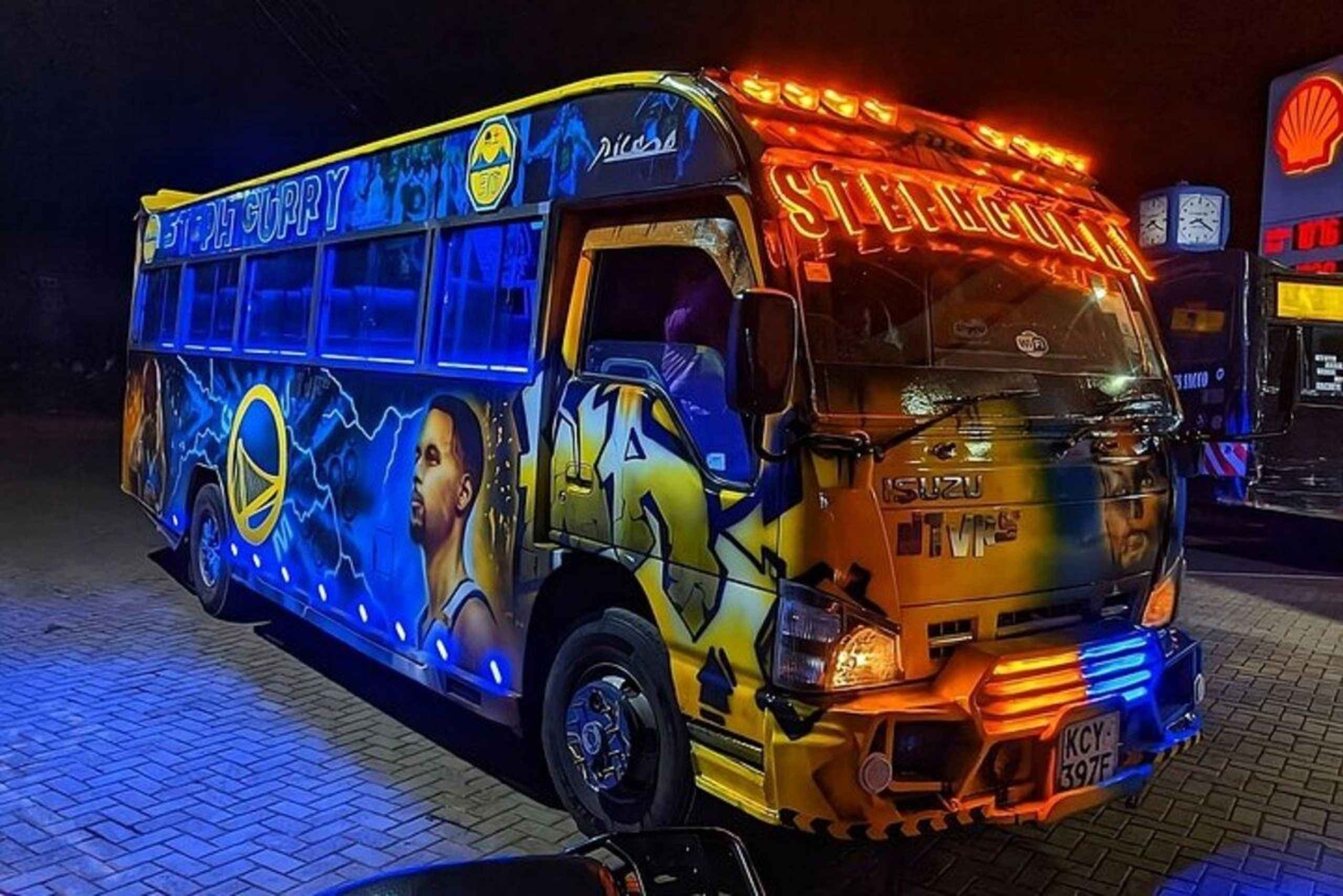 - Reis in een met graffiti beschilderde matatu met neonlichten en muziek